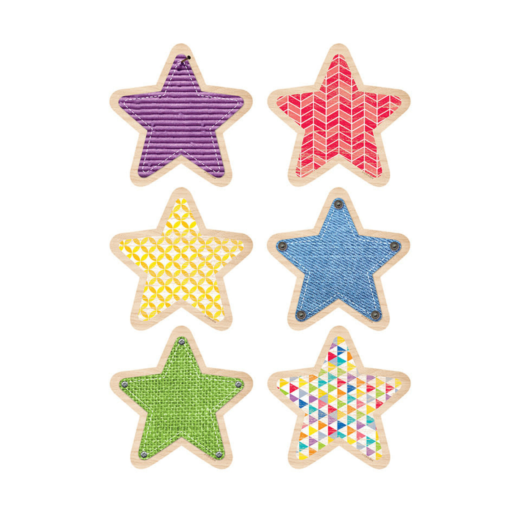 Rustic patterns, textures and woodgrain make these Stars 6" cut-outs perfect for any bulletin board or school space. The "mixed media" feel of denim, paint, burlap, corrugated paper, metal accents and weathered paint give these cut-outs a modern yet cozy feel.