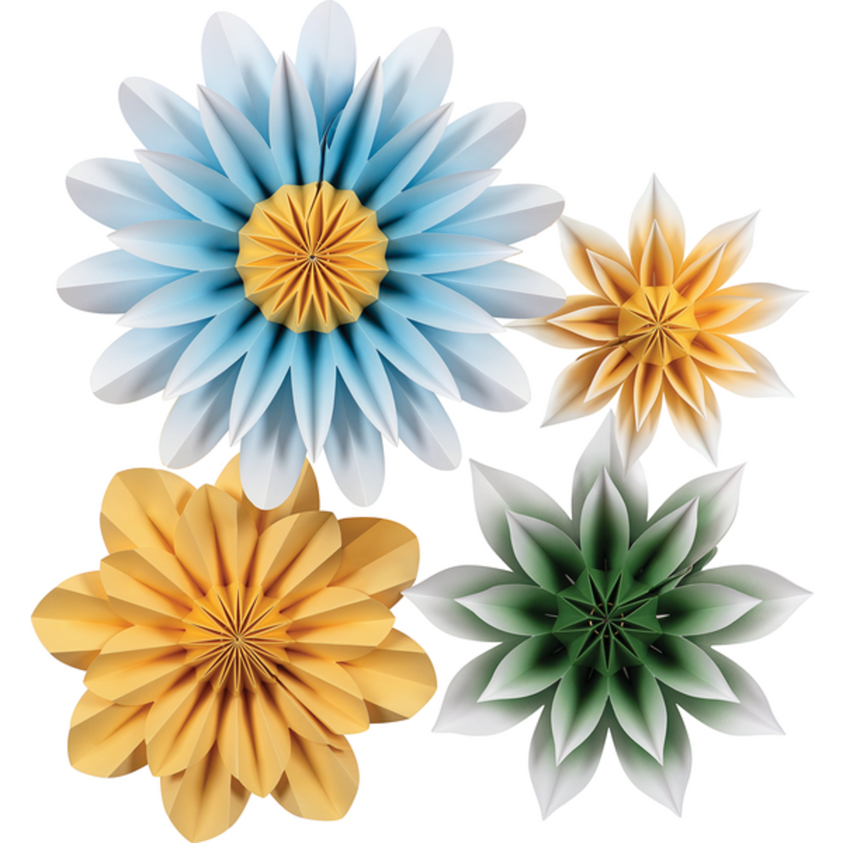 Create a colorful and unique look with these gorgeous paper flowers. Add depth and dimension to walls, backdrops, table decorations, and much more! No assembly required-opens easily and stays together with a hidden magnet. Folds back up for easy storage, so they can be used again and again. Four flowers per pack. Each pack includes one 16" light blue flower with yellow center, one 11" solid yellow flower, one 11" green flower, and one 8" yellow flower.
