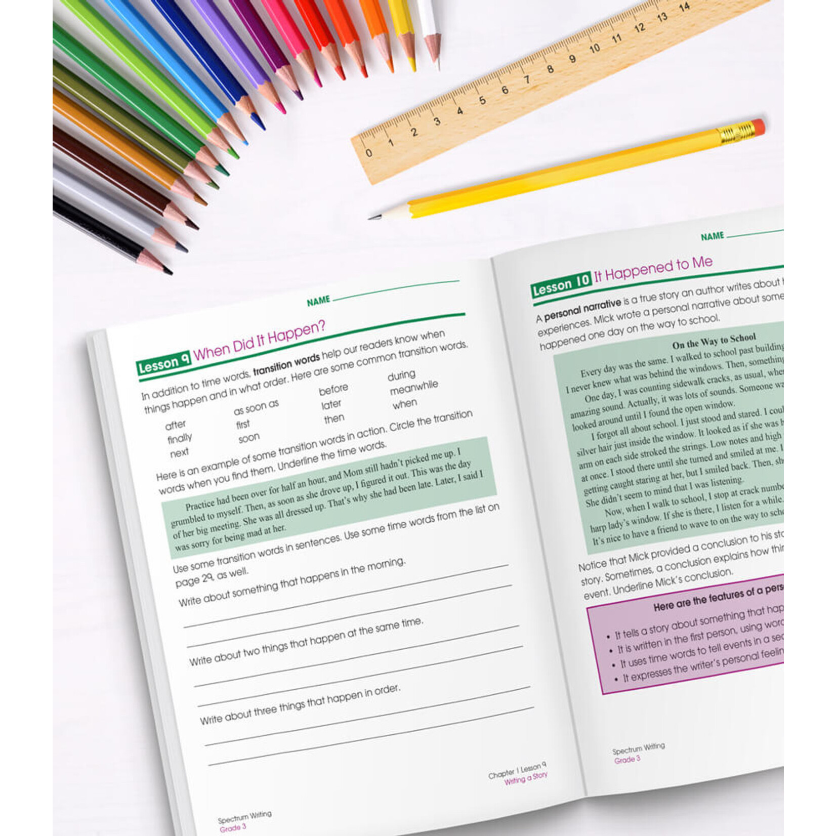Spectrum Writing for grade 3 guides students through each step of the writing process as they write sentences, personal stories, descriptions, how-to instructions, reports, opinions, and more. Spectrum Writing workbooks guide students as they write for a variety of purposes, including writing to tell a story, writing to provide information, and writing to state an opinion. Lessons support current state standards. Step-by-step instructions help with planning, drafting, revising, proofreading, and sharing writing. A Writer’s Handbook reinforces grammar and language skills, and a complete Answer Key is included. Engaging, open-ended writing projects combined with standards-based learning make these workbooks an essential resource for school success.